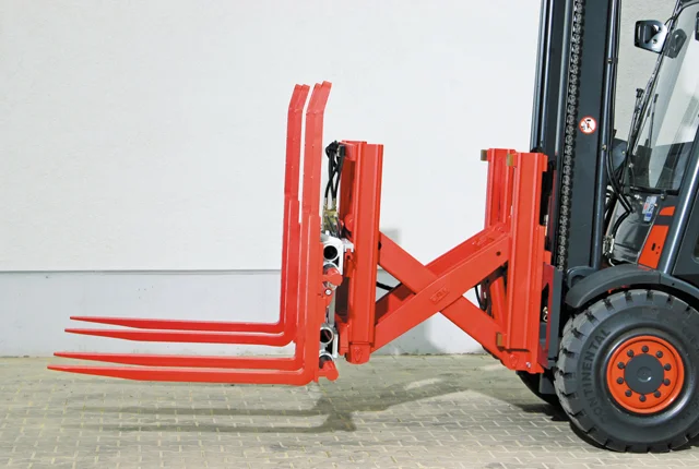 지게차 FORK BAR 전면에서 FORK와 백 레스트(BACK REST)가 길게 앞으로 뻗어나갈 수 있는 구조로 되어 있어 작업물을 먼 거리로의 상차 및 하역작업시 사용된다.